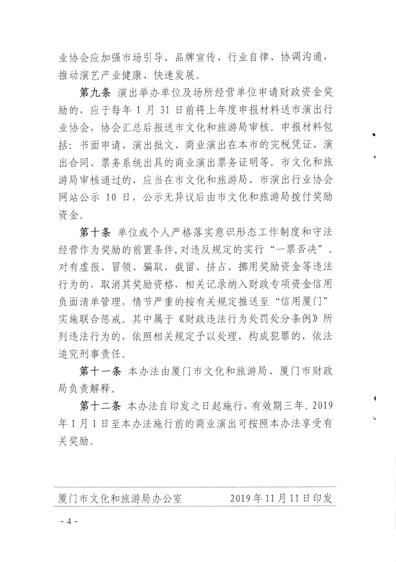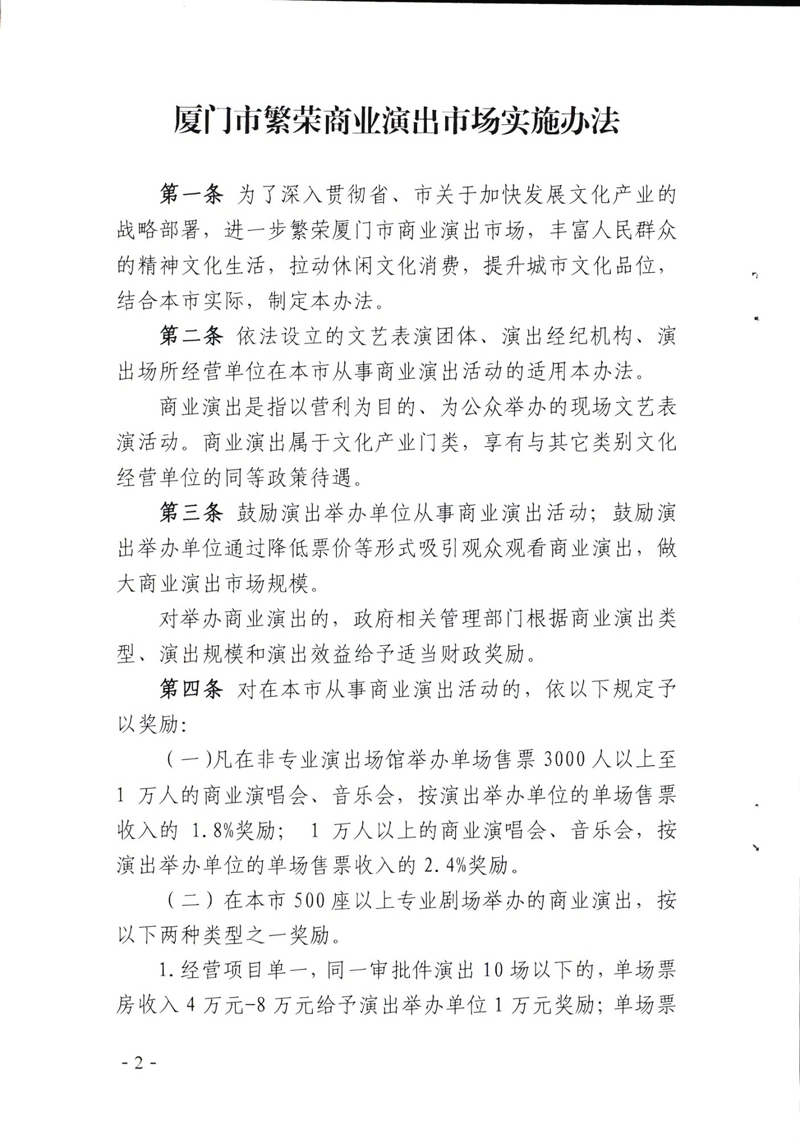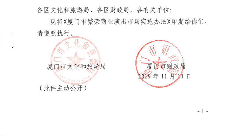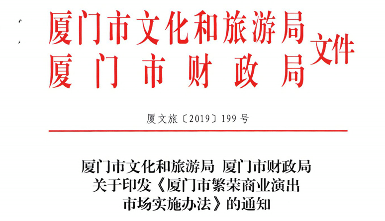 廈門(mén)市(shì)文(wén)化(huà)和(hé)∞γ÷旅遊局 廈門(mén)市(shì)财政局&♦>關于印發《廈門(mén)市(shì)繁榮商業(yè)演出市(shì)場(chǎng)實施辦₽§π法》的(de)通(tōng)知(zhī)